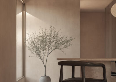El mobiliario introduce referencias al wabisabi y al estilo japandi: piezas de líneas sobrias, con acabados que valoran lo imperfecto, lo gastado y lo esencial. El conjunto respira serenidad, habitar pausado y consciente.