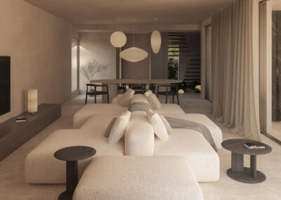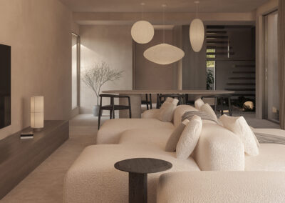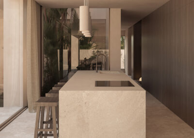 El interior de Casa Llinás se organiza a partir de la claridad funcional y la continuidad espacial. El salón, concebido como un espacio de encuentro, se abre hacia la terraza y la piscina, difuminando los límites entre interior y exterior. La cocina y el comedor, dispuestos en secuencia, ponen en valor esta idea de vida compartida, donde los espacios de uso cotidiano adquieren un carácter central y protagonista.
